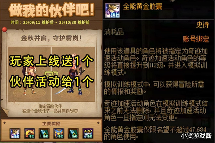 黄金胶囊作为能直升112级的道具,每次大型版本都会送,当然在9.11版本的国庆版本也不例外。在9.11版本上线后,玩家可以获得2个,一个是上线直接送,一个则是绑定伙伴活动获取。