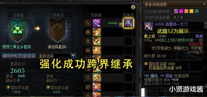 给的+12锻8武器可以丢一手13,如果成功可以跨界给其他职业,把材料武器放到左侧,再将需要继承的装备放到右侧,然后点击变换按钮,就能把跨界过来的强化属性继承下来了。