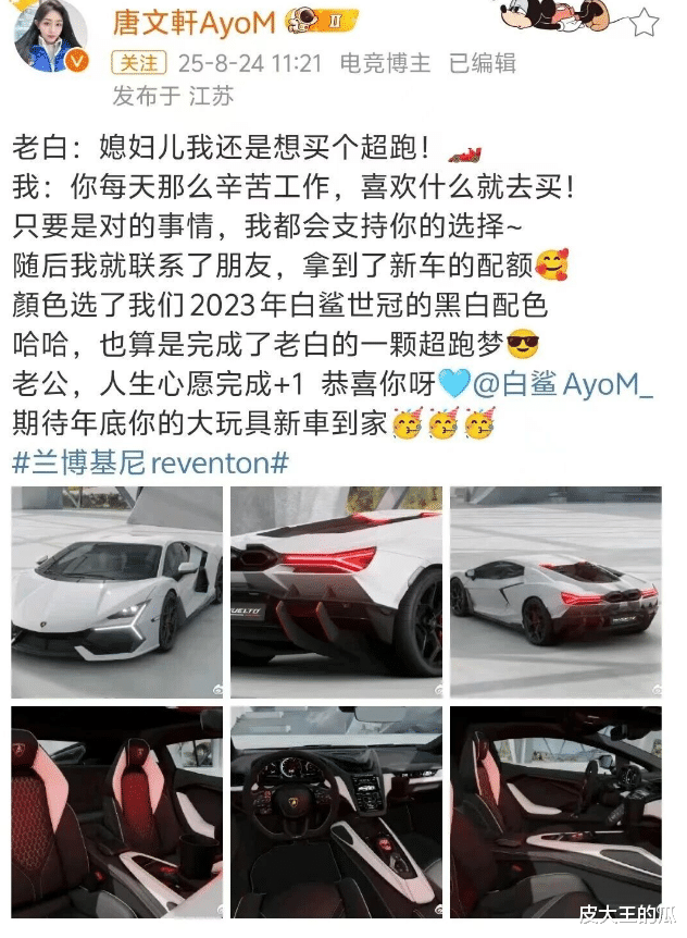 可没想到这才过了一年多,白鲨就再一次提了新车,而且还是不次于库里南的兰博基尼reventon,很多网友也是在唐文轩的这条帖子下方留言,网友感慨:白老板有你才更加成功!爱妻者风生水起!还有网友表示唐文轩就是天使投资人。