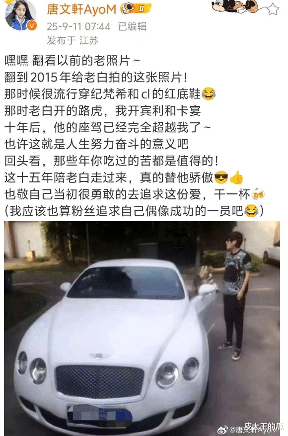最近唐文轩翻看相册,看到了2015年的一张老照片,图中的白鲨那时候还是很有非主流的气息,唐文轩表示那时候的白鲨开的还是路虎,自己开的是宾利和卡宴,但是十年过去了,如今白鲨的座驾已完全超越了自己,唐文轩表示这或许就是人生女里奋斗的意义吧。